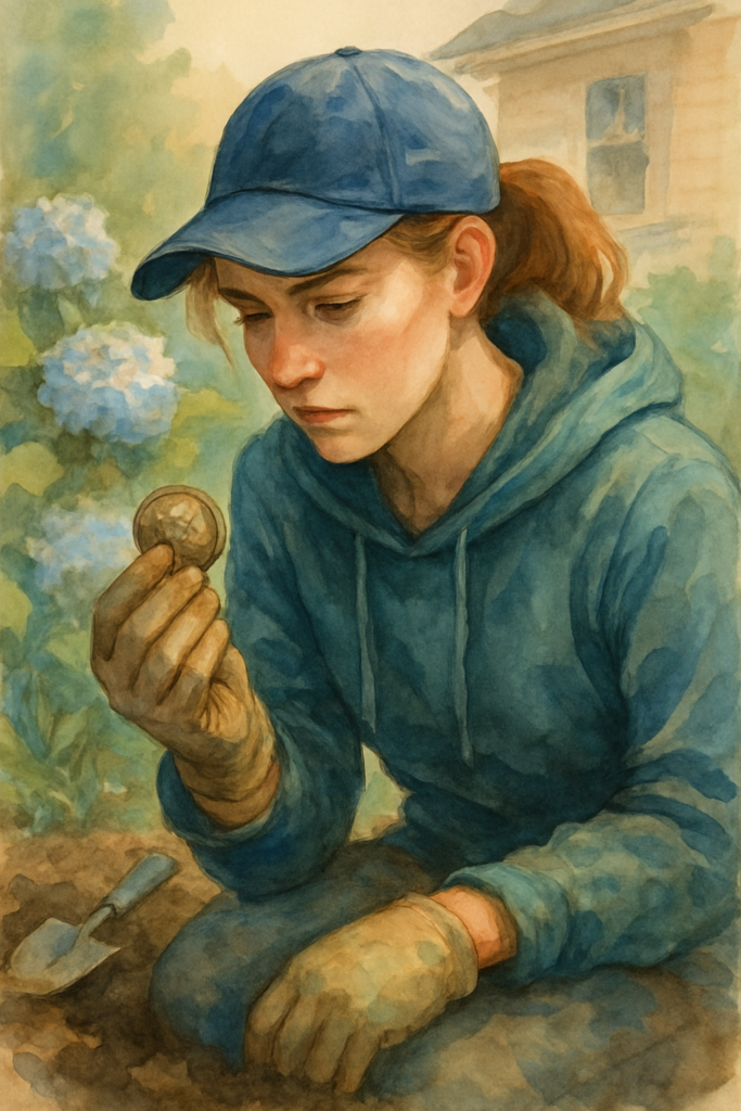 The earth gave less resistance than she expected. It hadn’t rained, but the ground was soft. The trowel made a crisp metallic “tink!” sound against something small and not quite rock, and when she pulled it free, her stomach filled with butterflies.